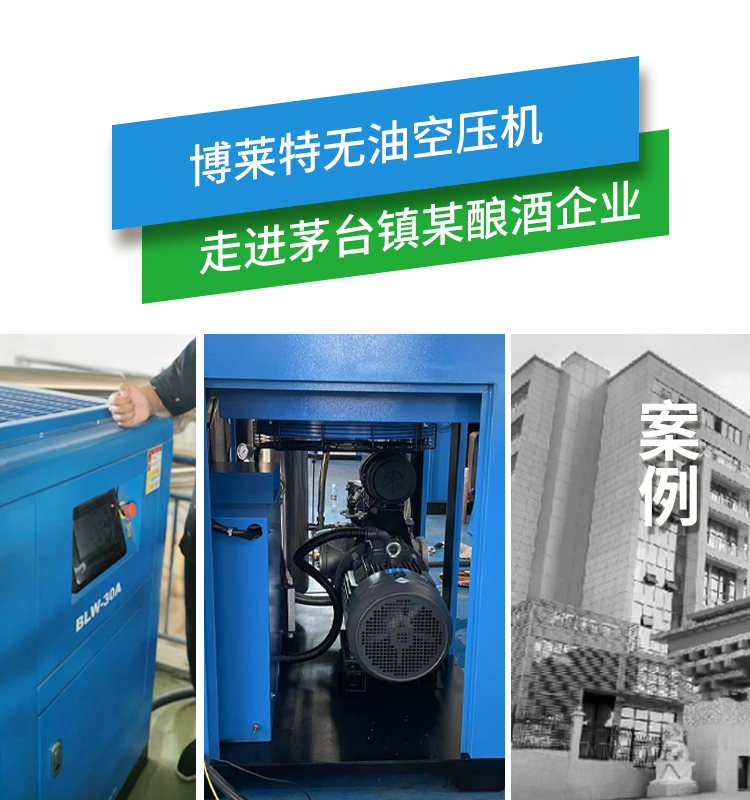 博莱特销售工程师通过实地考察和交流后,为用户提供了一套无油压缩空气解决方案。其中博莱特BLW无油水润滑系列空压机最终被用户选定,为白酒的生产提供满足要求的节能、无油的空气动力。